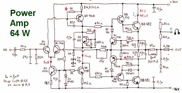 Figure 1 shows the schematic diagram of the audio power stage. This is a circuit built with discrete parts, 1970s technology. It was designed by me similar to the schematic of a power integrated circuit. If it is powered with ±50V, you can obtain 100W on audio output.