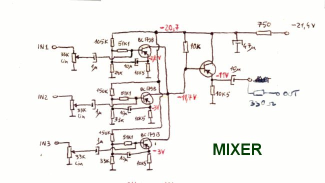 In figure 6 is the schematic diagram of the mixer with three inputs. There are two mixers in this audio station which allows you to mix six different input sources.