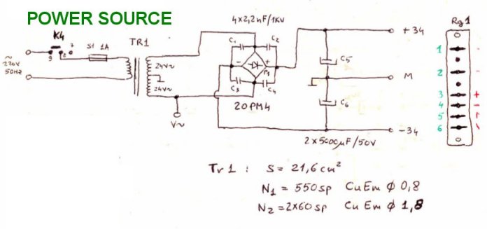 Figure 1 shows the schematic diagram of the audio power stage. This is a circuit built with discrete parts, 1970s technology. It was designed by me similar to the schematic of a power integrated circuit. If it is powered with ±50V, you can obtain 100W on audio output.