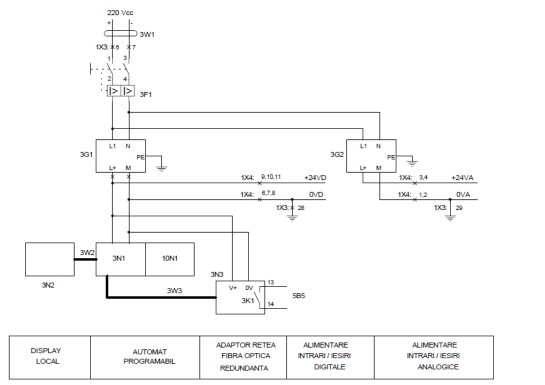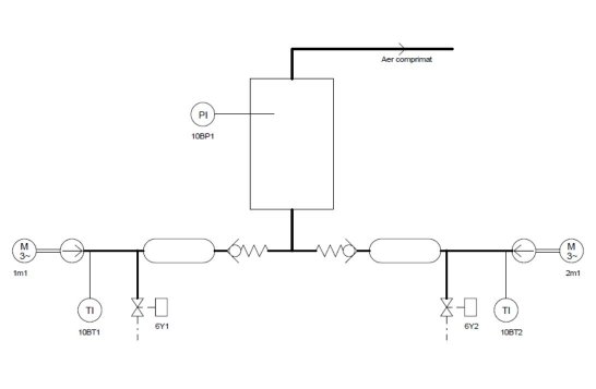 The installation subject to automation consists of two air compressors connected in parallel with check valves, which flow into a buffer tank, ensuring a maximum pressure of 10 bars. The compressors are driven by three-phase electric motors (1m1 and 2m1) with a power of 15 KW, powered by separate electrical networks (Bar1 and Bar2 respectively). The installation is sized so that a single functional compressor ensures the required compressed air flow, the second compressor being the "hot reserve". The starting mode of the motors is improved with the help of solenoid valves (6Y1 and 6Y2) which during the start-up period connect the compressor discharge to atmospheric pressure. Certain mechanical defects of the compressors are detected by measuring the temperature of the discharged air using the thermistors 10BT1 and 10BT2. The compressed air pressure in the buffer tank is measured with the 10BP1 pressure transducer.