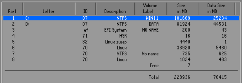 - fifth partition, logical 150 GB, NTFS for data, this section is seen by both Windows and Linux.